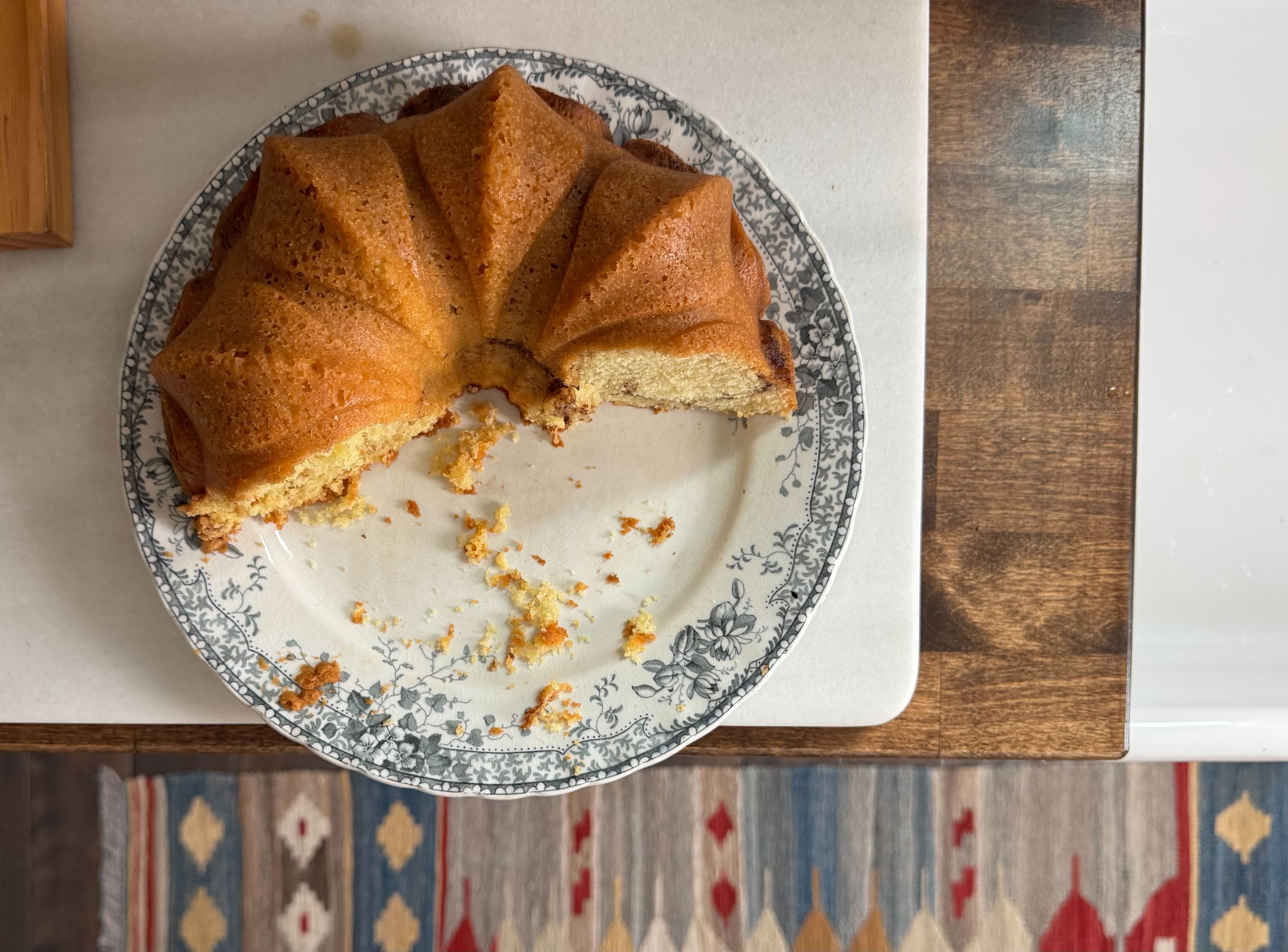 Bake at 350 for 45-50 minutes until toothpick inserted into center comes out clean. Let cool until warm enough to touch. Remove cake from Bundt pan. Slice and serve. Enjoy!